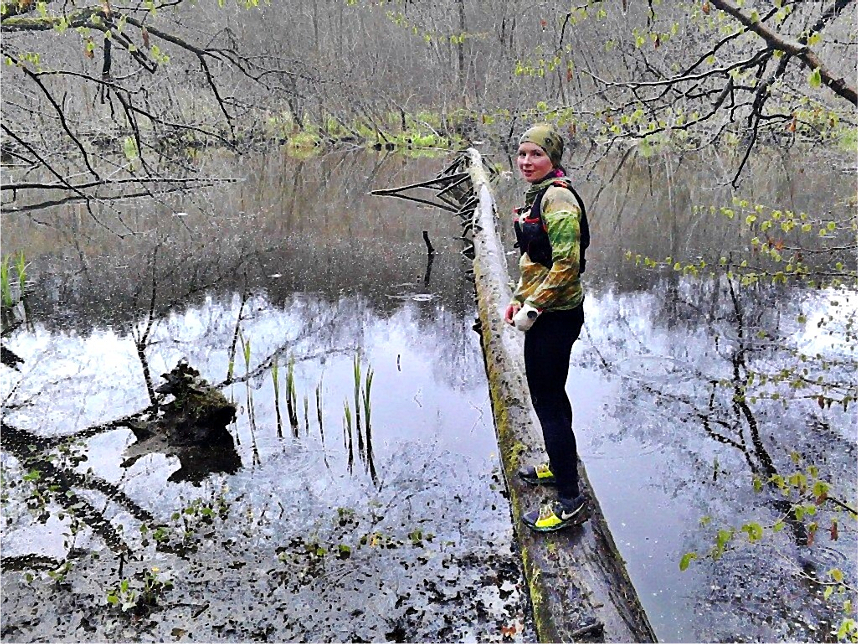 Pierwsze kilometry: Jeszcze jasno w lesie. But dobrze trzymał stopę, dając pełną kontrolę. Trasa nie była specjalnie wymagająca, ale zróżnicowana. Przewalone drzewo - swobodne przejście, mokre podłoże - przyczepność też jest dobra. Zaraz pod górę, czuć optymalną przyczepność.